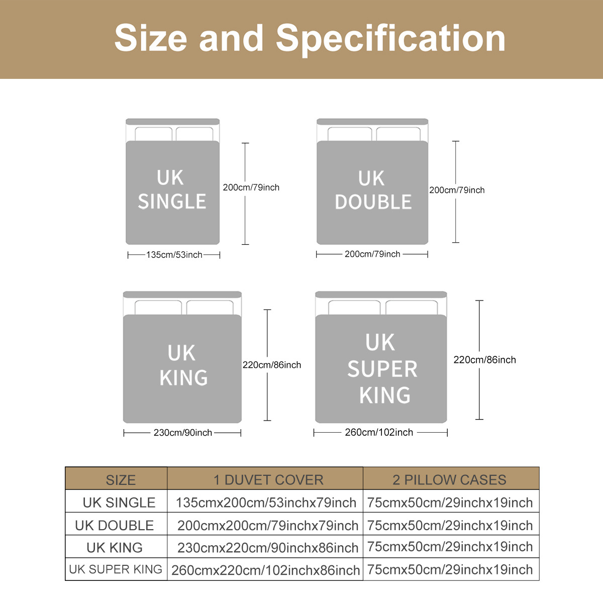Single:duvet cover (53×79 inches) and pillowcase (29×19 inches)